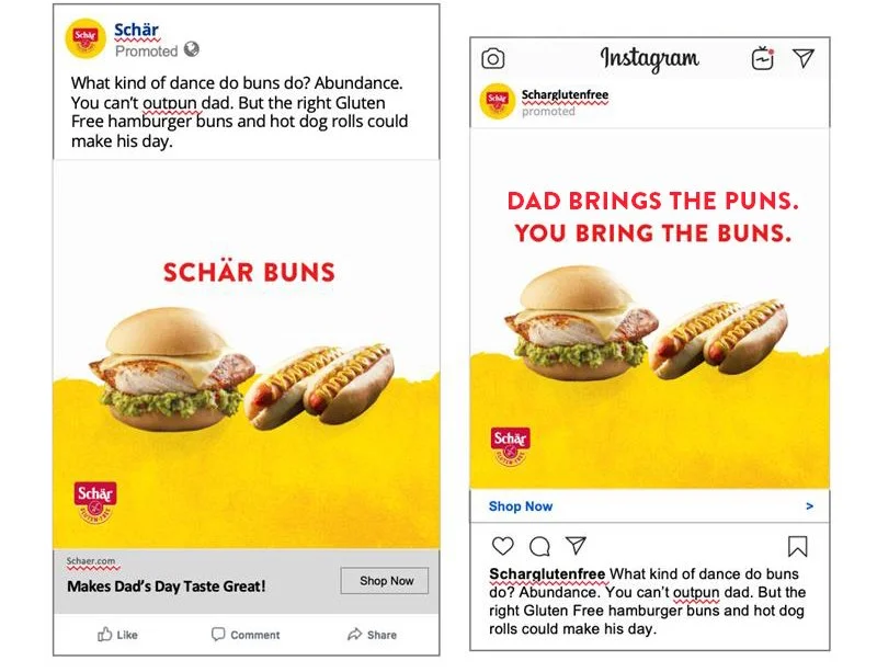 Schär makes gluten free products from crackers to hamburger buns. While maintaining a gluten-free diet can be a burden, Schär’s approach is to make it feel fun. So for Father’s Day and July 4th, we created some playful social posts that embrace the joys of summer—and the silliness of dad jokes!